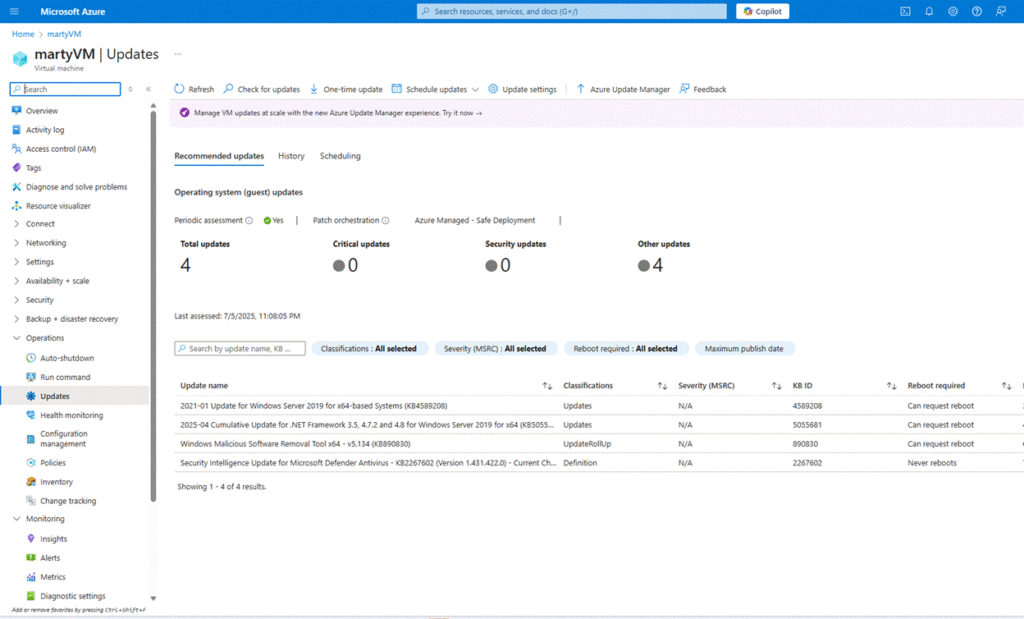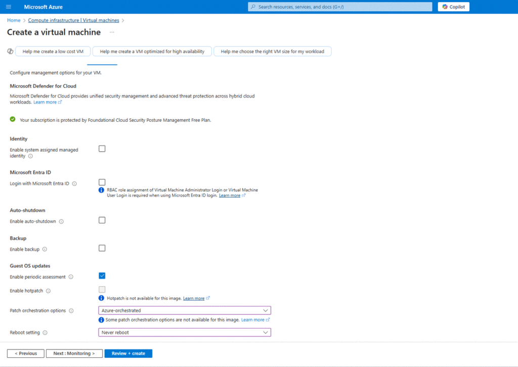 Below are the steps for manually creating a new Azure Virtual Machine and enabling automatic patching and updates.