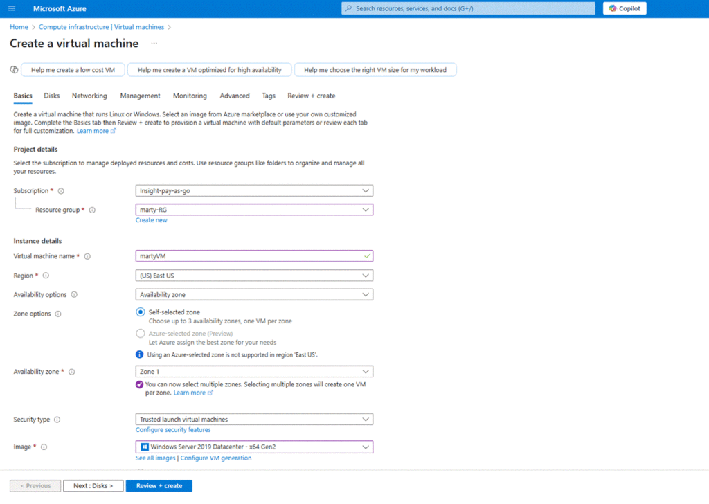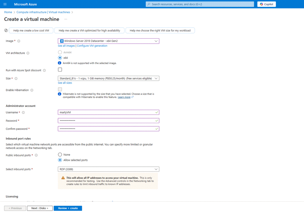 - Choose a region, image (e.g., Windows Server 2019), size, and admin username/password.