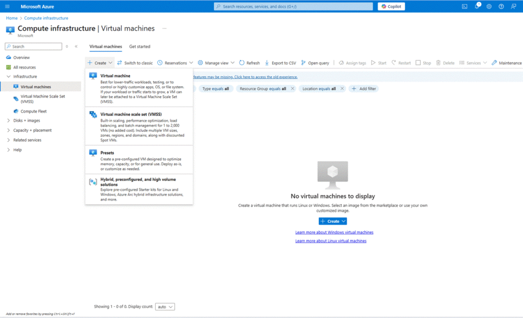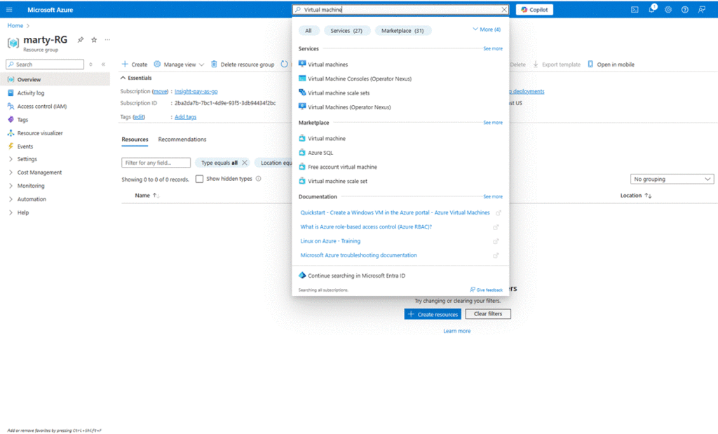 Go to the Azure Portal, click “Create a resource”, and search for “Virtual Machine”.