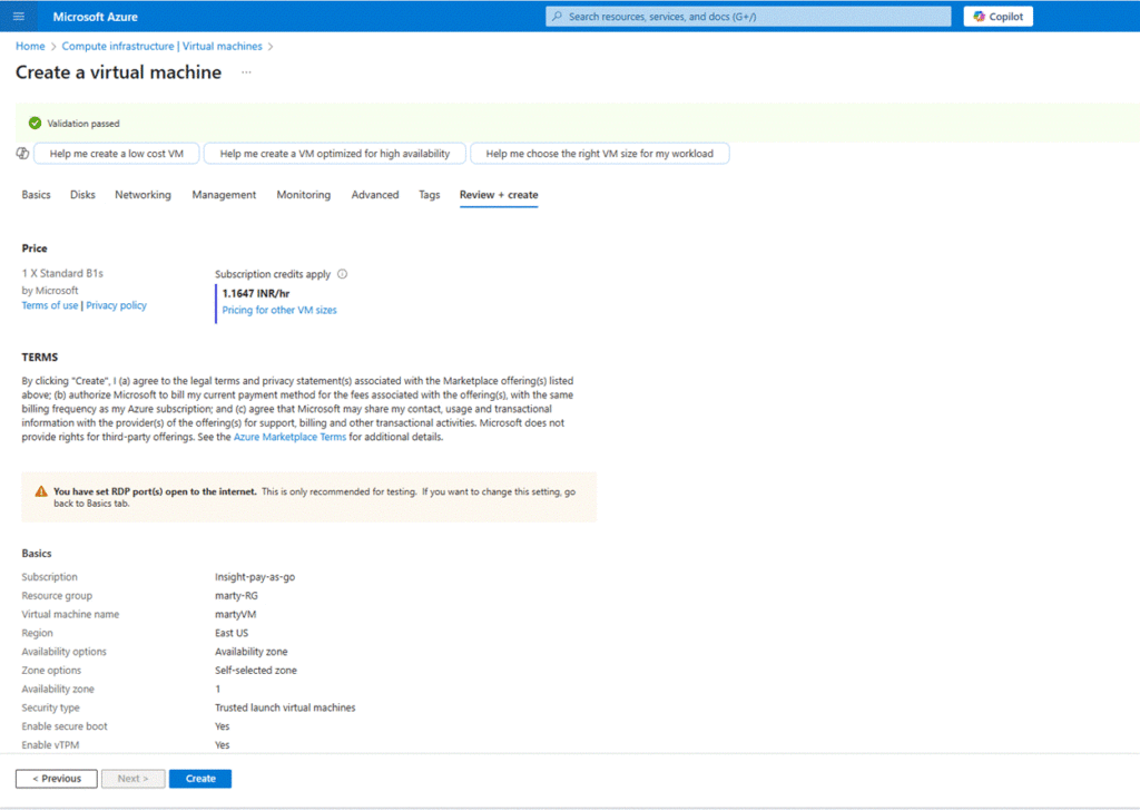 - Click “Create” to deploy the VM.