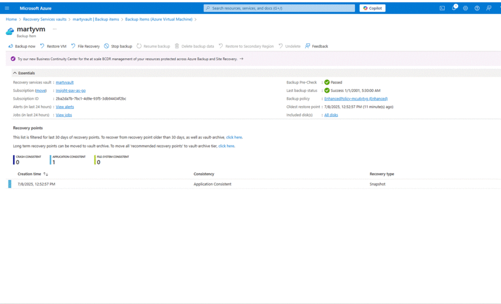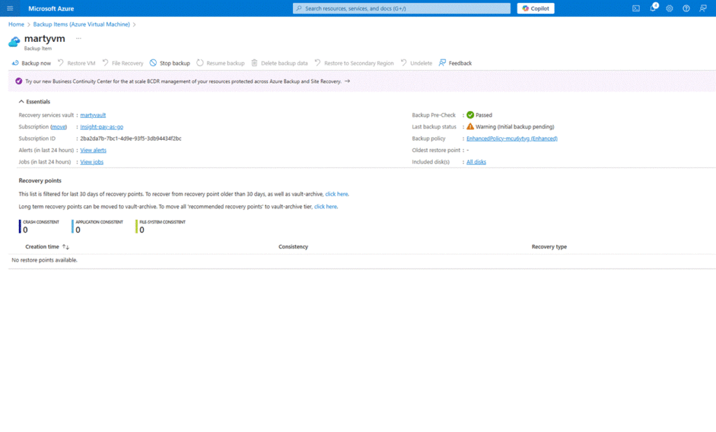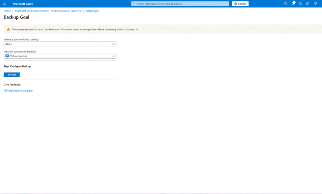 - Open the Recovery Services vault (martyvault) once it’s deployed.